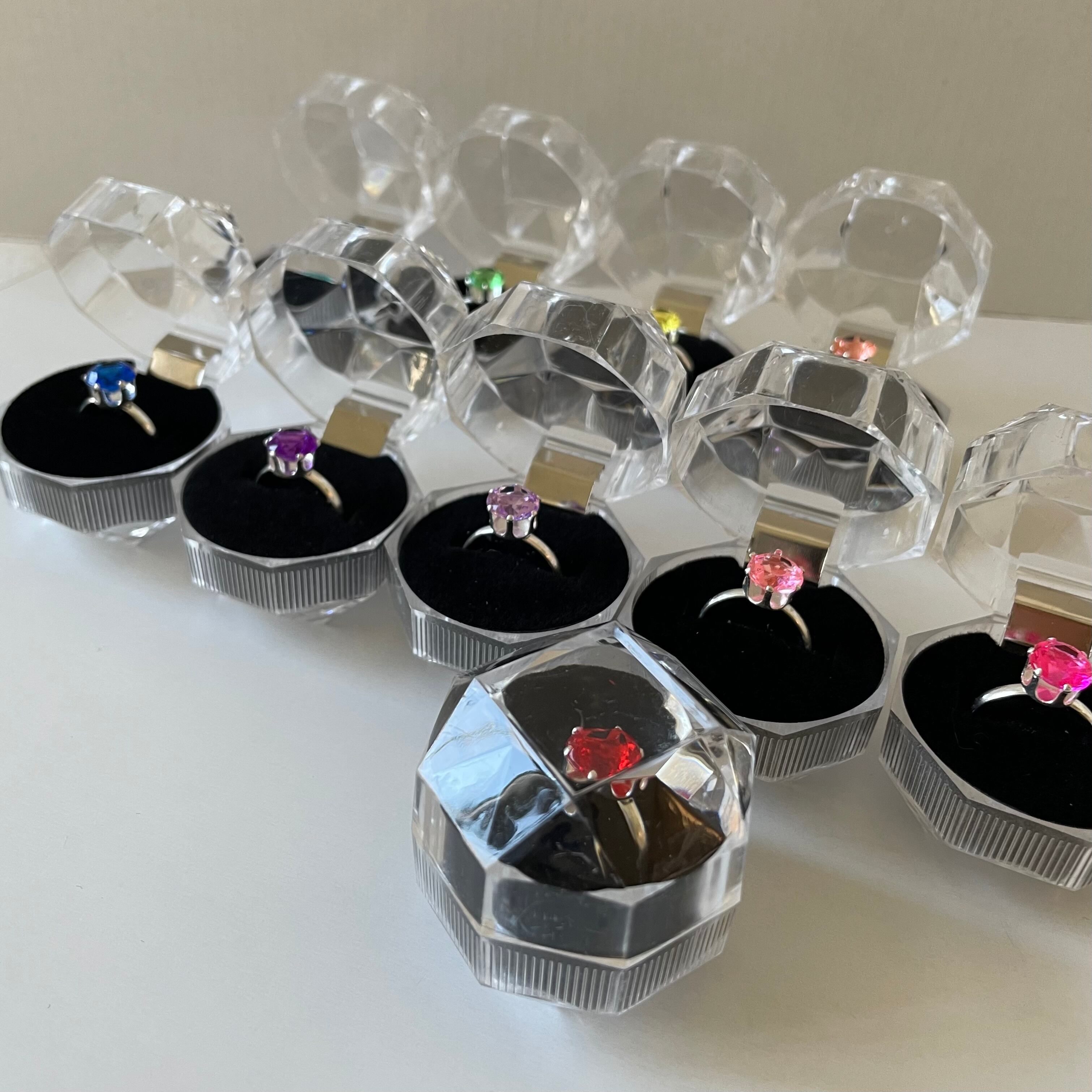 乙女心を撃ち抜かれたあなた、何色にしますか? 10色もあるなんて夢のようですよね。ダイヤモンドカットを立爪セッティング、細いリング部分、実は大人がつけても本気で素敵です。いつもは本物の宝石を身につけているあなた、たまには遊び心を出してみてもチャーミングです。小さな男の子がガールフレンドにプレゼントしたりしたら、何てロマンティックなのでしょう。キラキラのリングケース(台はベルベット風でエレガント)に入っているので、プロポーズも可能かもしれません。もちろんクリスマスギフトにもおすすめです。