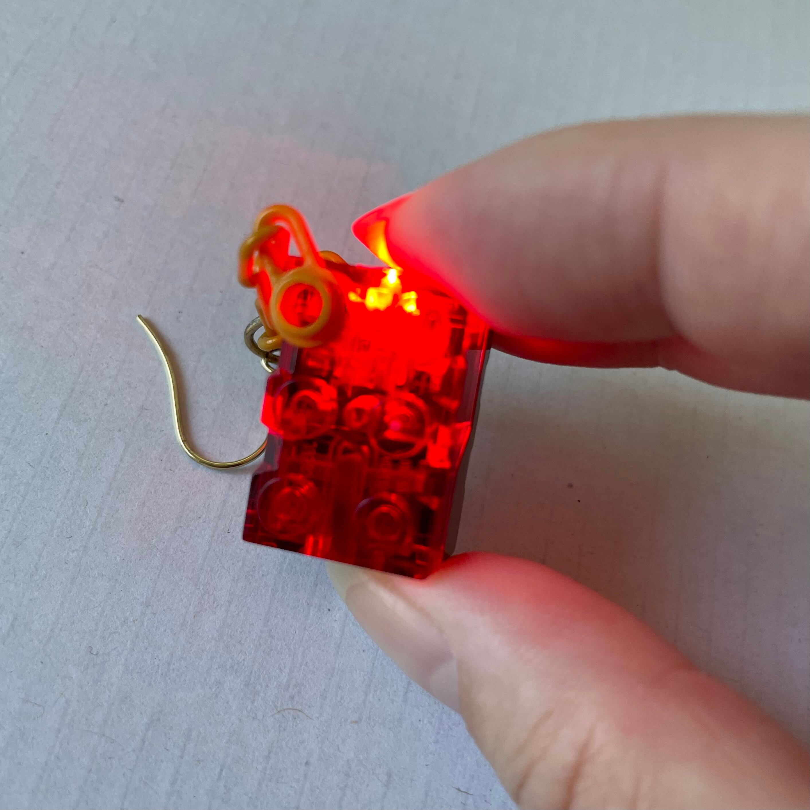 本物のおもちゃでできたピアス入荷しました。春節COLLECTIONとして、まさかの光るブロックピアスが登場です。春節といえば赤ですよね。新年から大注目のレッドのLEDで、縁起が良いことこの上なし。光るよ、とボタンを押すとフロアの人気者になれるだけではなく、非常時にも活躍するかもしれません。こちら、ピアスフックとリング以外はなんと...世界No.1おもちゃfromデンマークであるレゴのパーツが使われています。レゴのパーツ(ブロックとチェーン)は一切傷つけないようデザインされ、外せばそのままブロックとして遊べるという、まさに遊び心あふれるおしゃれアイテムです。スイッチを押した時のみ点灯する仕様ですが、パーティ中にずっと光っていてほしいあなたのために、スイッチを押しっぱなしにできるよう補助するためのブロックをおつけします。
